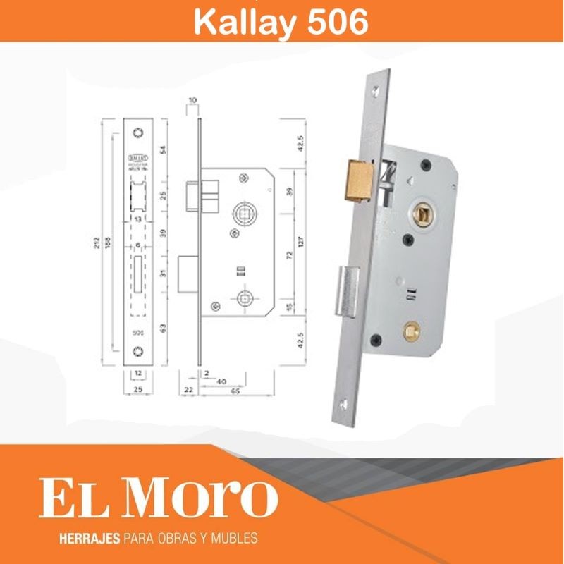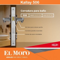 Cerradura para baño 506 KALLAY frente 25x212 mm. Caja 65x127mm. Contiene pestillo reversible. Frente de acero inoxidable. Sin llave para colocar perilla